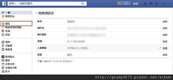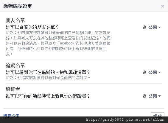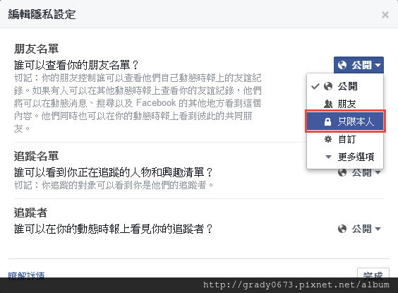 在隱私設定中可調整您個人的設置以及 公開以及不公開、限本人等自訂功能